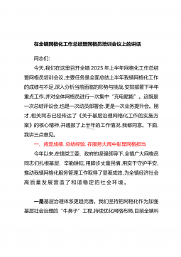 在全镇网格化工作总结暨网格员培训会议上的讲话同志们:今天,我们在这里召开全镇2025年上半年网格化工作总结暨网格员培训会议,主要任务是全面总结上半年我镇网格化工作的成绩与不足,深入分析当前面临的形势与挑战,安排部署下半年重点工作,并对全体网格员进行一次集中“充电赋能”。这既是一次总结评议会,也是一次动员部署会,更是一次业务提升会。刚才,相关同志已经传达了《关于基层治理网格化工作的实施方案》的核心精神,并通报了上半年的工作情况,我都同意。下面,我讲三点意见。一、肯定成绩,总结经验,在服务大局中彰显网格担当今年以来,在镇党工委、政府的坚强领导下,全镇广大网格员同志们扎根基层、辛勤耕耘,用脚步丈量民...