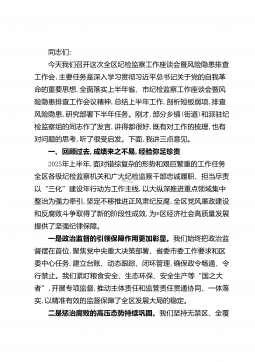 同志们:今天我们召开这次全区纪检监察工作座谈会暨风险隐患排查工作会,主要任务是深入学习贯彻习近平总书记关于党的自我革命的重要思想,全面落实上半年省、市纪检监察工作座谈会暨风险隐患排查工作会议精神,总结上半年工作,剖析短板弱项,排查风险隐患,研究部署下半年任务。刚才,部分乡镇(街道)和派驻纪检监察组的同志作了发言,讲得都很好,既有对工作的梳理,也有对问题的思考,听了很受启发。下面,我讲三点意见。一、回顾过去,成绩来之不易,经验弥足珍贵2025年上半年,面对错综复杂的形势和艰巨繁重的工作任务全区各级纪检监察机关和广大纪检监察干部忠诚履职、担当尽责以“三化”建设年行动为工作主线,以大纵深推进重点领域...
