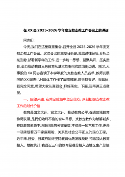 在XX县2025-2026学年度支教走教工作会议上的讲话同志们:今天,我们在这里隆重集会,召开全县2025-2026学年度支教走教工作会议。这次会议的主要任务是,总结过往经验,分析当前形势,部署新学年的工作,进一步统一思想、凝聚共识、压实责任,全力推动我县义务教育从基本均衡向优质均衡迈进。刚才,人事股的XX同志宣读了本学年度的支教走教人员名单,教师发展股的XX同志也对具体工作作了周密部署,讲得都很好、很具体,我完全同意,希望大家认真领会,抓好落实。下面,我再讲三点意见。一、回望来路,在肯定成绩中坚定信心,深刻把握支教走教工作的时代价值教育是国之大计、党之大计。推动教育公平,促进区域教育协调发展...