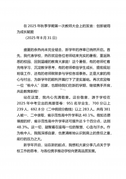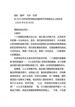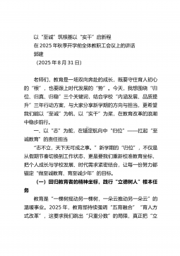 以仁爱之心铸就师魂用实干之笔书写华章在2025年暑期师德师风建设专题学习动员会上的讲话(2025年8月27日)过去的一年,我们共同经历了挑战,也共同分享了喜悦;我们见证了孩子们的点滴成长,也感受着龙潭中心小学这个大家庭的温暖与力量。大家的每一份付出,每一次坚守,都深深地镌刻在学校发展的年轮上,我为大家感到骄傲和自豪!今天,我们在这里召开暑期师德师风建设专题学习动员会可能有的老师心里会犯嘀咕:“怎么又提师德师风?每年都讲,是不是老生常谈?”我想说,老师们,恰恰相反。师德师风,不是挂在墙上的标语,不是束之高阁的文件,更不是用来应付检查的“套路”。它是什么?它是我们教育工作的“根”与“魂”。一棵大树...