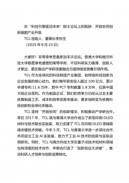 在“科创引擎驱动未来”院士论坛上的致辞:开放协同创新赋能产业升级TCL创始人、董事长李东生(2025年8月23日)大家好!非常荣幸受邀参加本次论坛。香港大学和南方科技大学都是享有盛誉的高等学府,不仅科研实力雄厚、创新人才辈出,更在推动产学研深度融合方面持续发挥着引领作用。TCL作为全球化的科技制造产业集团,始终视科技创新为企业发展的核心动力。我们每年研发投入超过100亿元,累计申请专利11.6万件,其中PCT专利数量1.9万件,位居中国大陆企业前列。作为制造企业,我们的竞争力已经从过去主要依靠制造工艺、成本和效率优势来驱动,更多地转变为依靠科技创新和全球化来驱动。TCL坚持“开放协同”的创新理...