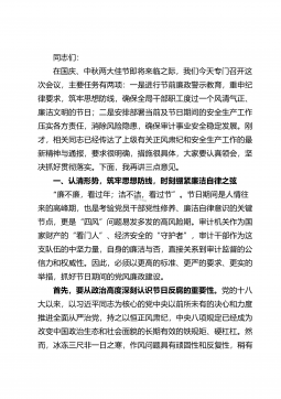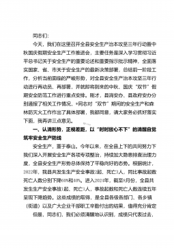 同志们:今天,我们在这里召开全县安全生产治本攻坚三年行动暨中秋国庆假期安全生产工作推进会,主要任务是深入学习贯彻习近平总书记关于安全生产的重要论述和重要指示批示精神,全面落实国家、省、市关于安全生产的最新决策部署,总结前一阶段工作,分析当前面临的严峻形势,对全县安全生产治本攻坚三年行动进行再动员、再部署,并就即将到来的中秋、国庆“双节”假期安全防范工作进行重点安排。刚才,县消安办、县政府安办分别通报了相关工作情况,*同志对“双节”期间的安全生产和森林防灭火工作作出了具体部署,我都同意,请大家务必抓好落实下面,我再讲三点意见。一、认清形势,正视差距,以“时时放心不下”的清醒自觉筑牢安全生产防线安...