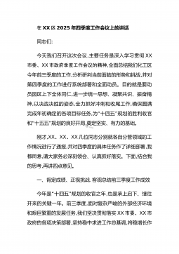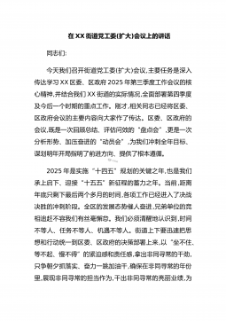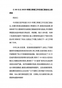 在XX街道2025年第三季度工作交流汇报会议上的讲话同志们:今天我们召开街道2025年第三季度工作交流汇报会议,主要任务是全面复盘前三季度的工作,客观总结成绩,深刻剖析不足,精准研判当前我们面临的形势与挑战,并对第四季度的决战冲刺进行再动员、再部署。刚才,各科室、各部门负责同志都作了很好的汇报,分管领导也进行了有针对性的点评,既肯定了亮点,也指出了问题,为我们下一步工作明确了方向。今年以来,在区委、区政府的坚强领导下,全街上下紧紧围绕年初确定的各项目标任务,同心同德,攻坚克难,各工项作都取得了来之不言易的积极进展。我们共同见证了XX片区城市更新项目取得阶段性成果,看到了XX老旧小区综合整治工程...