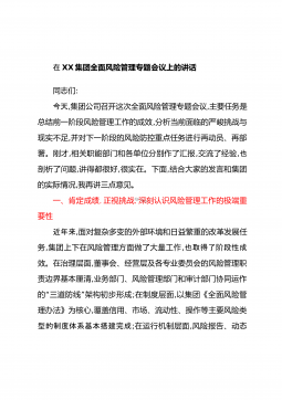 在XX集团全面风险管理专题会议上的讲话同志们:今天,集团公司召开这次全面风险管理专题会议,主要任务是总结前一阶段风险管理工作的成效,分析当前面临的严峻挑战与现实不足,并对下一阶段的风险防控重点任务进行再动员、再部署。刚才,相关职能部门和各单位分别作了汇报,交流了经验,也剖析了问题,讲得都很好,很实在。下面,结合大家的发言和集团的实际情况,我再讲三点意见。一、肯定成绩,正视挑战,深刻认识风险管理工作的极端重要性近年来,面对复杂多变的外部环境和日益繁重的改革发展任务,集团上下在风险管理方面做了大量工作,也取得了段性成阶效。在治理层面,董事会、经营层及各专业委员会的风险管理职责边界基本厘清,业务部门...