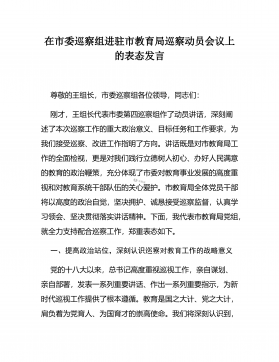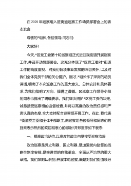 在2025年巡察组入驻街道巡察工作动员部署会上的表态发言尊敬的*组长,各位领导,同志们:大家好!今天,*区党工委第十轮巡察组正式进驻我街道开展巡察工作,并召开动员部署会。这充分体现了*区党工委对*街道工作的高度重视、对我们各项事业发展的深切关怀,以及对我们全体党员干部的关心爱护。刚才,*组长作了深刻的动员讲话,明确了本次巡察工作的重大意义、总体安排和具体要求,为我们指明了方向、提供了遵循。区巡察工作领导小组的同志也提出了明确要求。我们坚决拥护*区党工委的决定,诚恳接受巡察组的监督检查,并将以高度的政治责任感和严肃认真的态度,全力支持配合巡察组开展工作。在此,我代表*街道党工委和全体干部职工,向...