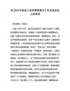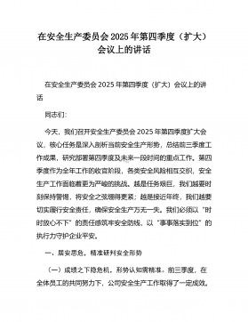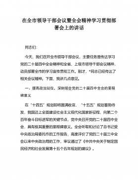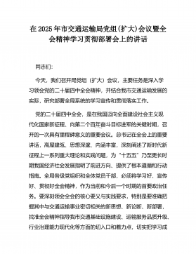 在2025年市交通运输局党组(扩大)会议暨全会精神学习贯彻部署会上的讲话同志们:今天,我们召开局党组(扩大)会议,主要任务是深入学习领会党的二十届四中全会精神,并结合我市交通运输发展的实际,研究部署全局系统的学习宣传和贯彻落实工作。党的二十届四中全会,是在我国迈向全面建设社会主义现代化国家新征程、向第二个百年奋斗目标进军的关键时期,召开的一次具有里程碑意义的重要会议。总书记在全会上的重要讲话,高屋建瓴、思想深邃、内涵丰富,深刻阐述了新时代新征程上一系列重大理论和实践问题,为“十五五”乃至更长时期我国经济社会发展指明了前进方向、提供了根本遵循和行动指南。全局各级党组织和全体党员干部,必须将学习好...