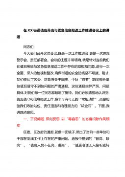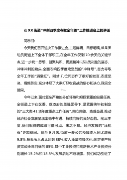 在XX“”街道冲刺四季度夺取全年胜工作推进会上的讲话同志们:今天我们召开这次工作推进会,主题鲜明、目标明确,就是要动员街道上下全体干部职工,在全年工作仅剩70余天的关键节点,进一步统一思想、凝聚共识、提振精神,以决战决胜的姿态、冲锋冲刺的劲头,“”全面吹响四季度攻坚战的冲锋号,奋力夺取“”全年工作的满堂红。刚才,几位同志作了很好的发言,态度坚决、措施务实,充分体现了大家打好收官战的信心和决心,我完全赞同。今年以来,面对复杂严峻的外部环境和艰巨繁重的发展任务,全街道上下在区委、区政府的坚强领导下,紧紧围绕年初制定“的三大类41”项年度重点工作任务,同心同德、克难奋进,推动经济社会发展呈现出稳中有...