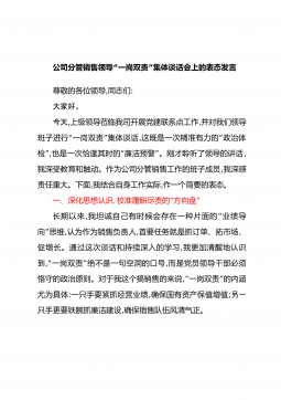 “”公司分管销售领导一岗双责集体谈话会上的表态发言尊敬的各位领导,同志们:大家好。今天,上级领导莅临我司开展党建联系点工作,并对我们领导“”班子进行一岗双责集体谈话,“这既是一次精准有力的政治体”检,“”也是一次恰逢其时的廉洁预警。刚才聆听了领导的讲话,我深受教育和触动。作为公司分管销售工作的班子成员,我深感责任重大。下面,我结合自身工作实际,作一个简要的表态。一、深化思想认识,“”校准履职尽责的方向盘长期以来,“我坦诚自己有时候会存在一种片面的业绩导”向思维,认为作为销售负责人,首要任务就是抓订单、拓市场、促增长。通过这次谈话和持续深入的学习,我更加清醒地认识到,“”一岗双责绝不是一句空洞的...