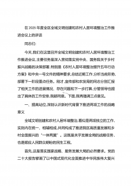 在2025年度全区全域文明创建和农村人居环境整治工作推进会议上的讲话同志们:今天,我们在这里召开全域文明创建和农村人居环境整治工作推进会议,主要任务是深入贯彻落实党中央、国务院关于乡村振兴战略的决策部署,特别是《农村人居环境整治提升五年行动方案》和中央一号文件的精神要求,总结近期工作,分析当前形势,部署下一阶段重点任务。刚才,宣传部和农发局的同志分别汇报了相关工作的进展情况、存在问题和下一步打算,分管领导也提出了具体的工作安排,我都同意。下面,我再强调三点意见。一、提高站位,深刻认识新时代背景下推进两项工作的战略意义全域文明创建和农村人居环境整治,看似是两项独立的工作,实则内在统一、相辅相成,...