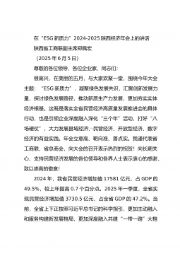 在“ESG新质力”2024-2025陕西经济年会上的讲话陕西省工商联副主席郑佩宏(2025年6月5日)尊敬的各位领导,各位企业家、同志们:很高兴,在美丽的五月,与大家欢聚一堂,围绕今年大会主题:“ESG新质力”,凝聚绿色发展共识,汇聚创新发展力量,探讨绿色发展路径,推动新质生产力发展,更加夯实实体经济根基。这既是落实全省民营经济高质量发展推进会的具体行动,也是引领企业深度融入深化“三个年”活动,打好“八场硬仗”,大力发展县域经济、民营经济、开放型经济、数字经济的有益实践。年会立意高、靶向准、落点实。我谨代表省工商联、省总商会,向大会的召开表示热烈的祝贺!向长期关心、支持民营经济发展的各位领导和...