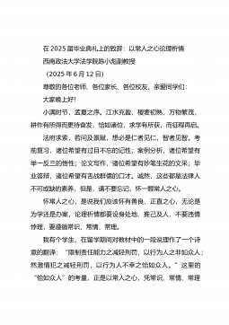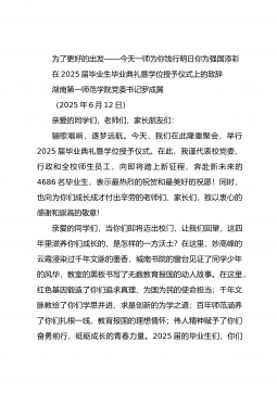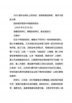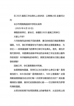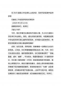 在2025届高三毕业典礼上的讲话:在时代的浪潮中追寻梦想石家庄二中实验学校校长焦桂华(2025年6月12日)亲爱的同学们,老师们:大家上午好!今天,我们怀着无比激动和不舍的心情,为2025届高三学生举行毕业典礼。首先,请允许我代表学校,向圆满完成高中学业的同学们致以最热烈的祝贺,对辛勤付出的老师们,默默支持的家长们致以最诚挚的感谢!此刻,站在这里,突然觉得,我更像是一位要送儿女远行的母亲。三年前,你们带着稚嫩的笑脸走进二南;今天,你们已长成目光坚定、胸怀理想的青年。你们用拼搏诠释了“坚毅、勤奋、诚朴、健美”。作为校长,我要郑重地说:25届的同学们,你们是二南的骄傲!三年间,教室里奋笔疾书的背影...