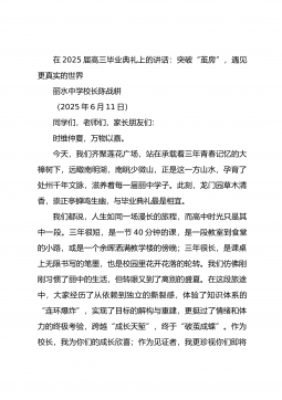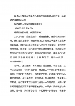 在2025届高三毕业典礼暨高考壮行仪式上的讲话:以奋进之姿赴星河万里互助县树人高级中学校长李长太(2025年6月4日)尊敬的各位老师、亲爱的同学们:大家上午好!盛夏临端午,时清日复长。在这个美好的时节,我们在这里集会,隆重举行2025届高三毕业典礼暨高考壮行仪式,共同见证高三年级871名同学光荣毕业,即将奔赴高考考场。在这里,我代表学校向圆满完成学业、开启新征程的同学们表示热烈的祝贺!向与你们风雨同舟、并肩偕行的老师们致以崇高的敬意!【更多写作资料+微信:nuo180914】同学们,夏日浓荫,万木凝香;时光荏苒,毕业已至。三年的时光很短,你们怀揣梦想、跨进树人中学大门的情景如在眼前;三年的时光...