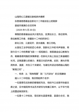 山海同心三度暖文脉相承共春晖在香港慈恩基金会新化十二中座谈会上的致辞娄底市港澳办主任邓伟(2025年5月20日)尊敬的慈恩基金会洪少棠先生,区美仪女士,各位领导,各位教育工作者,亲爱的十二中的同学们:新化三校,三度花开;资水潮涌,香江月明。从楚怡工业学校的匠心传承,到新化三中的书声琅琅,再到今日十二中的青春飞扬——短短数日,慈恩基金会以教育为舟,载着香港同胞的深情厚谊,在新化大地上划出三条温暖的长河。这既是爱心的接力,更是文化的共情。此刻,请允许我用传承、温度、共生三个关键词,与诸位共话这场跨越山海的“教育之约”。一、传承:从“简帛笔墨”到“三尺讲台”的文明赓续踏入十二中校园,我总想起两个名字...