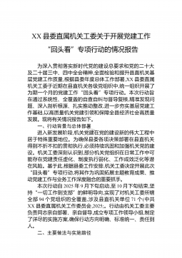 XX县委直属机关工委关于开展党建工作“回头看”专项行动的情况报告为深入贯彻落实新时代党的建设总要求和党的二十大及二十届三中、四中全会精神,全面检验和提升县直机关基层党建工作质量,根据县委年度总体工作部署,XX县委直属机关工委于近期在县直机关各级党组织中,统一组织开展了为期一个月的党建工作“回头看”专项行动。本次行动旨在通过系统性、全覆盖的自查自纠与督导复核,精准发现问题、深入剖析根源、扎实推动整改,进一步夯实基层党建工作基础,以高质量机关党建引领和保障全县经济社会高质量发展。现将有关情况报告如下。一、行动背景与总体部署进入新发展阶段,机关党建在党的建设新的伟大工程中居于特殊重要地位。为确保县委...