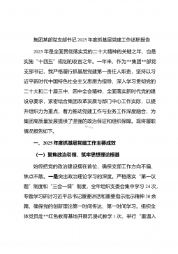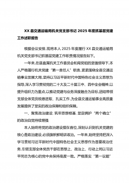 XX县交通运输局机关党支部书记2025年度抓基层党建工作述职报告根据会议安排,现将本人2025年度履行XX县交通运输局机关党支部书记抓基层党建工作职责情况报告如下。一年来,在县直属机关工作委员会和局党组的坚强领导下,本人严格履行机关党建“第一责任人”职责,紧紧围绕全县交通运输事业发展大局,坚持以习近平新时代中国特色社会主义思想为指导,深入学习贯彻党的二十大及二十届三中、四中全会精神,以提升组织力为重点,以推动党建与业务深度融合为目标,团结带领支部全体党员锐意进取、扎实工作,为全县交通运输事业高质量发展提供了坚实的政治保障和组织保障。一、聚焦政治建设,筑牢思想根基,坚定拥护“两个确立”的政治自觉...