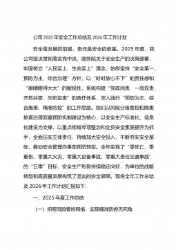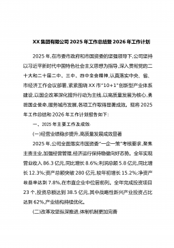 XX集团有限公司2025年工作总结暨2026年工作计划2025年,在市委市政府和市国资委的坚强领导下,公司坚持以习近平新时代中国特色社会主义思想为指导,深入贯彻党的二十大和二十届二中、三中、四中全会精神,认真落实中央、省、市经济工作会议部署,紧紧围绕XX“市10+1”创新型产业体系建设,以国企改革深化提升行动为主线,以高质量发展为核心,勇担国企使命,服务城市发展,各项工作取得显著成效。现将2025年工作和总结2026年工作划告如下计报:一、2025年主要工作及成效(一)经营业绩稳步提升,高质量发展成效显著2025年,“”公司全面落实市国资委一企一策考核要求,聚焦主责主业,加强经营管理,经济运行...