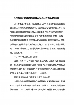 XX市投资(集团)有限责任公司2025年度工作总结2025“”年是十四五规划的收官之年,亦是公司在高质量发展征程上承前启后的关键之年。面对复杂多变的宏观经济环境与艰巨繁重的改革发展任务,公司董事会与经营管理层在市委、市政府的坚强领导下,坚持稳中求进的工作总基调,完整、准确、全面贯彻新发展理念,主动融入新发展格局,聚焦主责主业,深化改革创新,有效统筹发展与安全,各项工作均取得了显著成效,“”为十四五时期画上了圆满的句号,“”也为开启十五五新征程奠定了坚实基础。一、2025年主要工作与成效回顾2025年,公司上下同心,攻坚克难,在服务城市发展战略、推动自身转型升级的道路上取得了新的重要进展,发展基...
