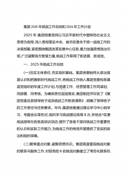 集团2025年统战工作总结和2026年工作计划2025年,集团党委坚持以习近平新时代中国特色社会主义思想为指导,深入贯彻落实中央、省市区委关于统一战线工作的决策部署,紧密围绕集团改革发展中心任务,着力加强思想政治引领,广泛凝聚各方智慧力量,统战工作取得了新进展、新成效。一、2025年统战工作总结(一)压实主体责任,夯实组织基础。集团党委始终从政治高度认识和把握新时代统战工作,将统战工作纳入集团党委和各基层党组织的年度工作计划,与党建工作、经营管理工作同谋划、同部署、同考核。为确保责任层层落实,集团制定并印发了《集团党委及其领导班子成员统战工作职责清单》,明确了领导班子的工作责任与任务要求。年内...