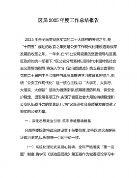 区局2025年度工作总结报告2025年是全面贯彻落实党的二十大精神的关键之年,是“十四五”规划的收官之年更是公安工作现代化建设迈向纵深发展的攻坚之年。一年来,在*市公安局党委的坚强领导与区委、区政府的统一部署下,*区公安分局坚持以新时代中国特色社会主义思想为指导,将深入学习《谈治国理政》第五卷全面贯彻党的二十届四中全会精神与高质量推进学习教育紧密结合,围绕“公安工作现代化”这一核心主线,以“大学习、大执行、大落实、大创新”活动为强劲引擎,统筹推进防风险、保安全、护稳定、促发展各项工作,实现了辖区社会大局的持续稳定和公安队伍战斗力的显著跃升,为*区经济社会高质量发展贡献了坚实的公安力量。一、深化...