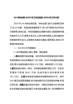XX市林业局2025年工作总结及2026年工作计划2025年,XX市林业局在省、市林业部门的大力指导和支持下,在XX市委、市政府的坚强领导下,深入学习贯彻习近平生态文明思想,坚持以省、市系列重要会议精神为指引,紧紧围绕市委、市政府中心工作,聚焦主责主业,以林长制为统领,以深化集体林权制度改革为动力,以绿美生态建设为基础,狠抓落实,各项工作取得阶段性成效。一、2025年工作开展情况(一)科学推进国土绿化,增厚“绿色家底”一是精准提升森林质量。依托市林科所的资源与技术优势,专项培育林分优化所需苗木150万株。2025年全面完成既定任务,累计全面完成林分优化4.32万亩、森林抚育5.25万亩。二是推...