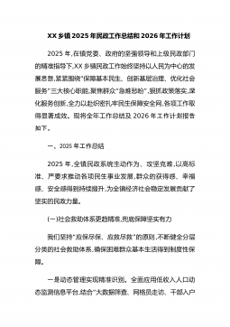 XX乡镇2025年民政工作总结和2026年工作计划2025年,在镇党委、政府的坚强领导和上级民政部门的精准指导下,XX乡镇民政工作始终坚持以人民为中心的发展思想,“紧紧围绕保障基本民生、创新基层治理、优化社会”服务三大核心职能,“”聚焦群众急难愁盼,狠抓政策落实,深化服务创新,全力以赴织密扎牢民生保障安全网,各项工作取得显著成效。现将全年工作总结及2026年工作划告计报如下。一、2025年工作总结2025年,全镇民政系统主动作为、攻坚克难,以高标准、严要求推动各项民生事业发展,群众的获得感、幸福感、安全感得到持续提升,为全镇经济社会稳定发展贡献了坚实的民政力量。(一)社会救助体系更趋精准,兜底...