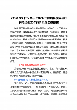 XX镇XX社区关于2026年度城乡居民医疗保险征缴工作的阶段性总结报告城乡居民基本医疗保险制度是国家为保障广大人民群众基本医疗需求、减轻疾病经济负担而建立的一项基础性、普惠性、兜底性的民生保障制度。做好每年度的参保缴费工作,是维护社会和谐稳定、提升人民群众幸福感与安全感的重要基石。根据上级部门的统一部署和要求,XX镇XX社区自2025年9月下旬启动2026年度城乡居民基本医疗保险集中征缴工作以来,始终坚持“以人为本,服务居民”的核心原则,精心组织,周密部署,扎实推进,力求实现“应保尽保、应缴尽缴”的工作目标。现将本阶段的工作开展情况、存在的问题及下一步工作计划总结报告如下。一、工作开展基本情况...