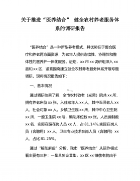 关于推进“医养结合”健全农村养老服务体系的调研报告“医养结合”是一种新型养老模式,其优势在于整合医疗和养老两方面资源,为老年人提供连续性、协调性和整体性的医养护一体化服务。近期,xx市xx调研组深入xx县和xx区,紧紧围绕建立健全农村养老服务体系开展专题调研。现将情况报告如下:一、基本情况通过调研结果了解,全市农村敬老(光荣)院共xx所,拥有养老床位xx张,入住老年人xx人,其中五保老人xx人,社会对象xx人。乡镇卫生院xx所,其中中心卫生院xx所,一般卫生院xx所,编制床位数xx张。人员编制数xx名,实际在编在岗人员xx人,占81.14%,实际在岗人员(含聘用)xx人,卫生专业技术在岗人员(...