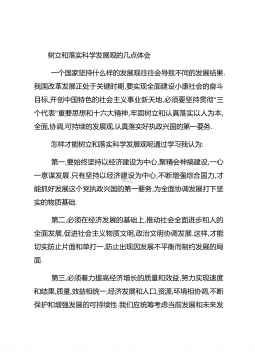 树立和落实科学发展观的几点体会一个国家坚持什么样的发展观往往会导致不同的发展结果.我国改革发展正处于关键时期,要实现全面建设小康社会的奋斗目标,开创中国特色的社会主义事业新天地,必须要坚持贯彻"三个代表"重要思想和十六大精神,牢固树立和认真落实以人为本,全面,协调,可持续的发展观,认真落实好执政兴国的第一要务.怎样才能树立和落实科学发展观呢通过学习我认为:第一,要始终坚持以经济建设为中心,聚精会神搞建设,一心一意谋发展.只有坚持以经济建设为中心,不断增强综合国力,才能抓好发展这个党执政兴国的第一要务,为全面协调发展打下坚实的物质基础.第二,必须在经济发展的基础上,推动社会全面进步和人的全面发展...