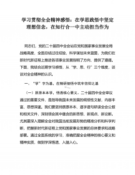 学习贯彻全会精神感悟:在学思践悟中坚定理想信念,在知行合一中主动担当作为同志们,党的二十届四中全会站在党和国家事业发展全局战略高度,全面总结过往经验,科学谋划未来蓝图,为我们在新时代新征程上推进各项事业发展指明了方向、提供了遵循。下面,我结合近期学习感悟,从“学、思、行”三个维度,谈谈对全会精神的认识。一、“学”字为基,在精研细悟中筑牢信仰之基(一)原原本本学,悟透核心要义。二十届四中全会审议通过的重要文件,是指导我国未来发展的纲领性文献,内容丰富、思想深邃。我们要坚持原原本本、逐字逐句研读全会公报和相关文件,深刻领会其中蕴含的新思想、新观点、新论断。尤其要深入理解全会对我国当前发展形势的精准...