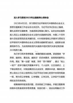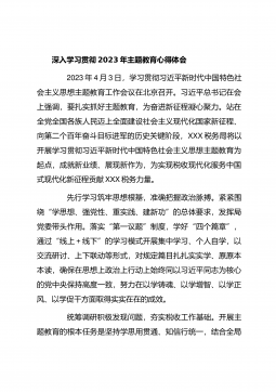 深入学习贯彻2023年主题教育心得体会 2023年4月3日,学习贯彻习近平新时代中国特色社会主义思想主题教育工作会议在北京召开。习近平总书记在会上强调,要扎实抓好主题教育,为奋进新征程凝心聚力。站在全党全国各族人民迈上全面建设社会主义现代化国家新征程、向第二个百年奋斗目标进军的历史关键阶段,XXX税务局将以开展学习贯彻习近平新时代中国特色社会主义思想主题教育为起点,成就新业绩、展现新作为,为实现税收现代化服务中国式现代化新征程贡献XXX税务力量。 先行学习筑牢思想根基,准确把握政治脉搏。紧紧围绕“学思想、强党性、重实践、建新功”的总体要求,发挥局党委带头作用。落实“第一议题”制度,学好...