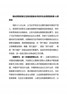 强化思想武装立足岗位助推全市经济社会高质量发展心得体会党的十八大以来,以习近平同志为主要代表的中国共产党人,坚持把马克思主义基本原理同中国具体实际相结合、同中华优秀传统文化相结合,以巨大的政治智慧和理论勇气,创立了习近平新时代中国特色社会主义思想,开辟了马克思主义中国化时代化新境界。近期参加习近平新时代中国特色社会主义思想主题教育,我深受教育启迪,对“两个确立”的决定性意义领悟更加深刻,增强“四个意识”、坚定“四个自信”、做到“两个维护”的政治自觉不断提升。结合所学所思所悟和工作实际,谈一谈自己的认识体会和工作打算。加强学习,进一步提高思想认识。第一,这是马克思主义中国化的最新成果。马克思主义...