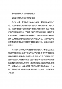 企业会计模拟实习心得体会范文企业会计模拟实习心得体会范文我们在7月5号开始了本次会计实习,采取模拟实习的方式,使用印制好的资料作为整个会计实习的材料来源。通过实习,熟悉并掌握会计流程的各个步骤及其具体操作--包括了解账户的内容和基本结构,了解借贷账户法的记账规则,掌握开设和登记账户以及编制会计分录的操作、原始凭证填制和审核的操作以及根据原始凭证判填制记账凭证的方法。以使学生对会计有更深的理性认识并掌握会计基本操作技能。这是本次实习的目的!此次的实习为我们深入社会,体验生活提供了难得的机会,让我们在实际的社会活动中感受生活,了解在社会中生存所应该具备的各种能力.利用此次难得的机会,我努力工作,严...