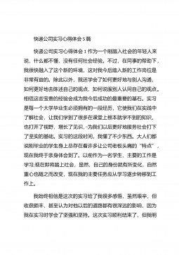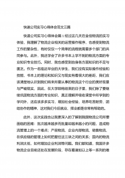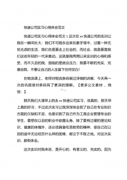 快递公司实习心得体会范文快递公司实习心得体会范文1这次在xx快递公司的实训让我在一瞬间长大:我们不可能永远呆在象牙塔中,过着一种无忧无虑的生活,我们总是要走上社会的,而社会,就是要靠我们这些年轻的一代来推动。这就是我两周以来实训的心得和感受,而不久后的我,面临的是就业压力,我要不断的充实、完善自我,不要让自己的人生留下任何空白!在物流课上,老师对物流条码做过详细的讲解,今天再一次的巩固使对条码有了更深的理解。【更多公文素材,微信:】那天我们大清早上的去xx快递公司实习,说真的,那天早上真的好冷,不过此次实习让我深深体会到了自己在专业知识方面的欠缺和不足,也意识到了自己作为工商企业管理专业的学生...