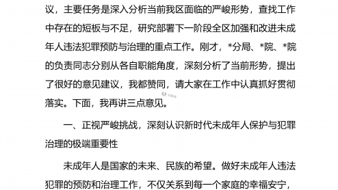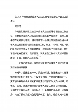 在2025年度全区未成年人违法犯罪专项整治工作会议上的讲话同志们:今天我们召开这次全区未成年人违法犯罪专项整治工作会议,主要任务是深入分析当前我区面临的严峻形势,查找工作中存在的短板与不足,研究部署下一阶段全区加强和改进未成年人违法犯罪预防与治理的重点工作。刚才,*分局、*院、*院的负责同志分别从各自职能角度,深刻分析了当前形势,提出了很好的意见建议,我都赞同,请大家在工作中认真抓好贯彻落实。下面,我再讲三点意见。一、正视严峻挑战,深刻认识新时代未成年人保护与犯罪治理的极端重要性未成年人是国家的未来、民族的希望。做好未成年人违法犯罪的预防和治理工作,不仅关系到每一个家庭的幸福安宁,更直接关系到...