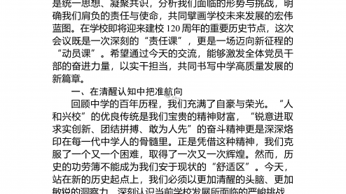 讲稿:凝心聚力,勇担使命,共绘学校发展新蓝图同志们:今天,我们在这里召开全体党员干部大会,主要目的是统一思想、凝聚共识,分析我们面临的形势与挑战,明确我们肩负的责任与使命,共同擘画学校未来发展的宏伟蓝图。在学校即将迎来建校120周年的重要历史节点,这次会议既是一次深刻的“责任课”,更是一场迈向新征程的“动员课”。希望通过今天的交流,能够激发全体党员干部的奋进力量,以实干担当,共同书写中学高质量发展的新篇章。一、在清醒认知中把准航向回顾中学的百年历程,我们充满了自豪与荣光。“人和兴校”的优良传统是我们宝贵的精神财富,“锐意进取求实创新、团结拼搏、敢为人先”的奋斗精神更是深深烙印在每一代中学人的骨...