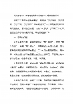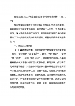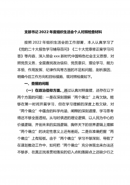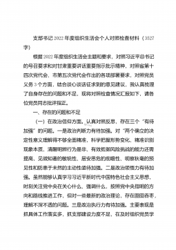 支部书记2022年度组织生活会个人对照检查材料(3527字)根据2022年度组织生活会主题和要求,对照习近平总书记的号召要求和对甘肃重要讲话重要指示批示精神,对照省第十四次党代会、市第五次党代会作出的各项部署要求,对照党员义务3个方面,结合谈心谈话征求到的意见建议,我认真梳理了自身存在的问题和不足,现将对照检查情况汇报如下,请各位党员同志批评指正。一、存在的问题和不足(一)在政治信仰方面。认真对照反思,存在三个“有待加强”的问题。一是政治判断力有待加强。对“两个确立的决定性意义理解得不够全面精准,科学把握形势变化、精准识别现象本质、清醒明辨行为是非、有效抵御风险挑战的能力还需提高,见微知著的敏...