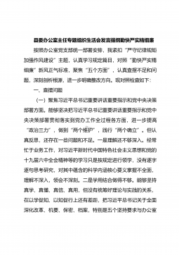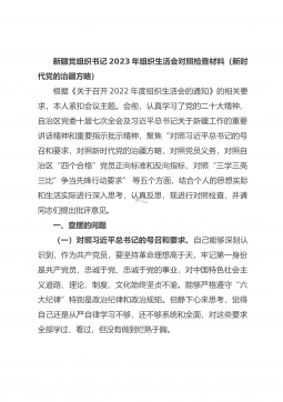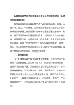 新疆地区副主任2023年组织生活会对照检查材料(新时代党的治疆方略)按照此次组织生活会的要求,本人紧扣会议主题。会前,认真学习了党的二十大精神、自治区党委十届七次全会及习近平总书记关于新疆工作的重要讲话精神和重要指示批示精神,聚焦“对照习近平总书记的号召和要求,对照新时代党的治疆方略,对照党员义务,对照自治区“四个合格”党员正向标准和反向指标,对照“三学三亮三比”争当先锋行动要求”等五个方面,深入查摆存在的问题和不足,深入剖析产生问题的原因,明确了努力方向整改措施。现对照检查如下:一、查摆的问题(一)对照习近平总书记的号召和要求。1.学习习近平新时代中国特色社会主义思想不深不实,缺乏学深学透的...