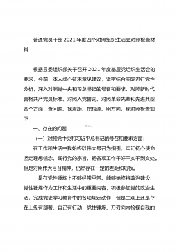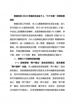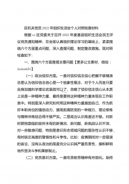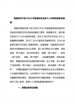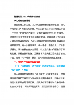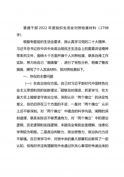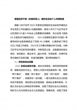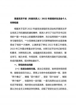 普通党员干部(科室负责人)2022年度组织生活会个人对照检查根据关于召开2022年度党支部组织生活会和开展民主评议党员工作的通知的通知精神,我深入学习了习近平总书记在党的**届一中全会上的重要讲话精神,充分运用党的**大报告学习辅导百问、**大党章修正案学习问答等辅导材料全面准确领会了党的**大精神,认真研读了单位2022年度工作报告、2023年工作要点等重点学习内容。对照习近平总书记的号召和要求,对照党员义务,全面查找在政治信仰、党员意识、理论学习、能力本领、作用发挥、纪律作风等方面的不足和问题,形成问题清单。现对照检查如下。一、存在的突出问题(一)在政治信仰方面。政治立场坚定,始终坚持党的...