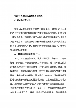 支部书记2022年度组织生活会个人对照检查材料根据2022年度组织生活会主题和要求,对照习近平总书记的号召要求和对甘肃重要讲话重要指示批示精神,对照省第十四次党代会、市第五次党代会作出的各项部署要求,对照党员义务3个方面,结合谈心谈话征求到的意见建议,我认真梳理了自身存在的问题和不足,现将对照检查情况汇报如下,请各位党员同志批评指正。—、存在的问题和不足(一)在政治信仰方面。认真对照反思,存在三个“有待加强”的问题。一是政治判断力有待加强。对“两个确立的决定性意义理解得不够全面精准,科学把握形势变化、精准识别现象本质、清醒明辨行为是非、有效抵御风险挑战的能力还需提高,见微知著的敏锐性、居安思危...