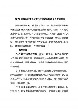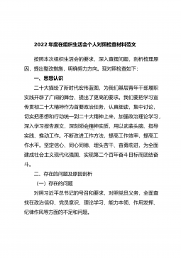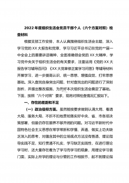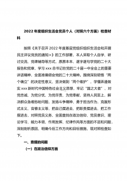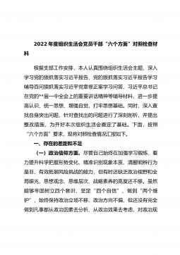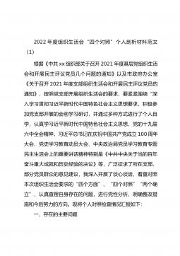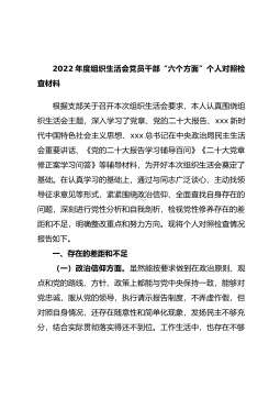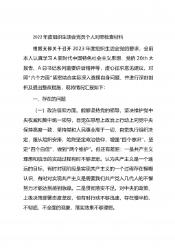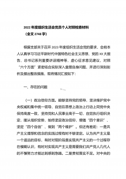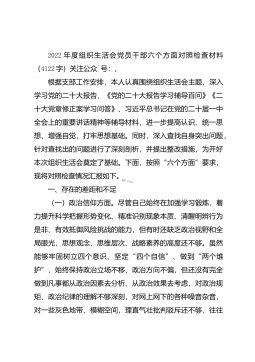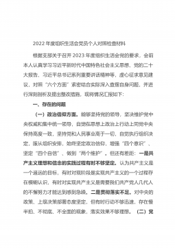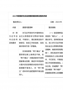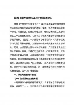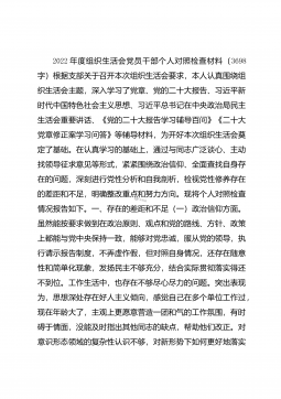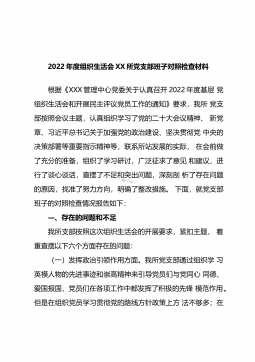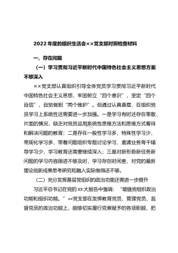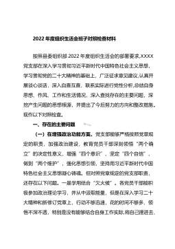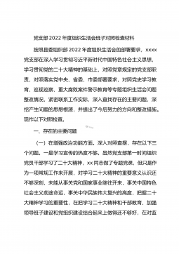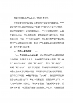2022年度组织生活会班子对照检查材料按照县委组织部2022年度组织生活会的部署要求,XXXX党支部在深入学习贯彻习近平新时代中国特色社会主义思想,学习贯彻党的二十大精神的基础上,广泛征求意见建议,认真开展谈心谈话,深入自查互查,联系实际进行党性分析,总结自身思想、作风、工作和生活情况,深入查找存在的主要问题,深挖产生问题的思想根源,并提出了今后努力的方向和整改措施。现作以下对照检查。一、存在的主要问题(一)在增强政治功能方面。党支部能够严格按照党章规定的职责,加强政治建设,教育党员干部深刻领悟“两个确立”的决定性意义,增强“四个意识”、坚定“四个自信”、做到“两个维护”,强化思想引领,坚持用...