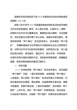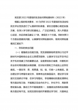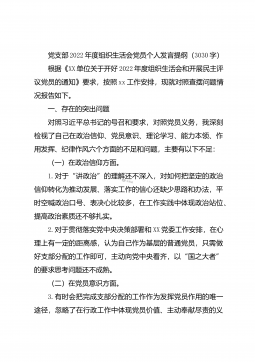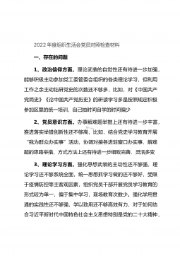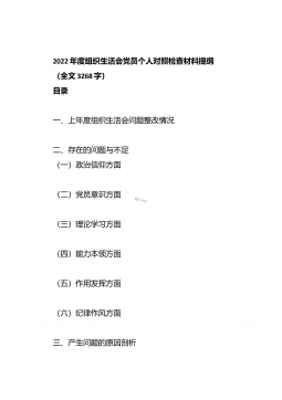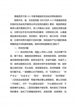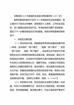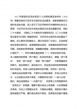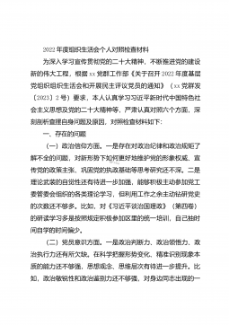 2022年度组织生活会党员个人对照检查发言材料(3656字)根据支部关于召开本次组织生活会要求,我紧紧围绕本次组织生活会主题,深入学习了习近平新时代中国特色社会主义思想、习近平总书记在中央政治局民主生活会重要讲话、党的二十大报告、《党的二十大报告学习辅导百问》《二十大党章修正案学习问答》等辅导材料,为开好本次组织生活会奠定了基础。在认真学习的基础上,通过与同志广泛谈心、主动找领导征求意见等形式,紧紧围绕政治信仰、全面查找自身存在的问题,深刻剖析思想根源,明确整改措施,现将对照检查情况汇报如下:一、存在问题及具体表现(一)在政治信仰方面。本人能够深刻领悟“两个确立”的决定性意义,增强“四个意识”...