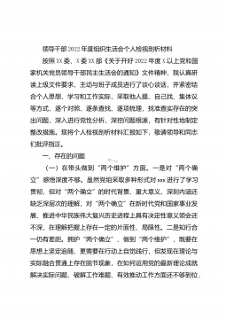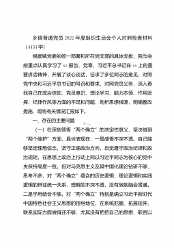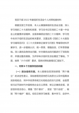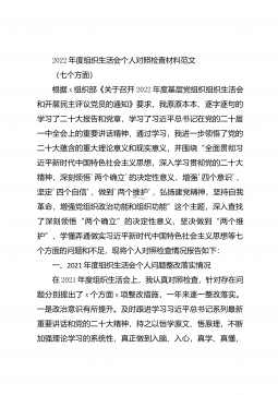 2022年度组织生活会个人对照六个方面检查材料(全文5776字)根据统一安排,会前本人认真开展学习研讨,学习了党的XX大精神及《习近平谈治国理政》第四卷等内容,同时,广泛征求意见建议,深入开展谈心谈话,全面检视剖析问题,做了扎实充分准备。现对照检查如下。一、查摆的问题(一)在政治信仰方面一是对“两个确立”的深刻内涵领悟不到位。在学习工作中,能够带头深刻感悟“两个确立”的决定性意义,坚定信仰信念信心,但对照反思还存在学得不够深入,理解得不够透彻、运用得也不够到位等问题。理论学习不够系统深入,开展学习比较单一,大多围绕上级要求的特定主题开展,学习钻研不够透彻,在理解理论的来龙去脉,判断的因果依据和...