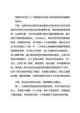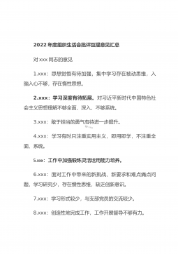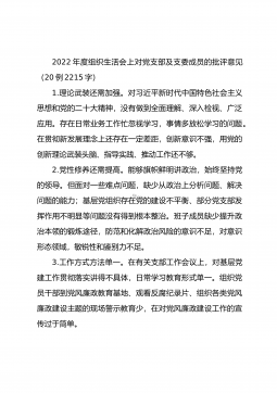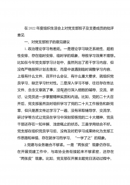 2022年度组织生活会上对党支部及支委成员的批评意见(20例2215字)1.理论武装还需加强。对习近平新时代中国特色社会主义思想和党的二十大精神,没有做到全面理解、深入检视、广泛应用。存在日常业务工作忙忽视学习,事情多放松学习的问题。在贯彻新发展理念上还存在一定差距,创新意识不强,用党的创新理论武装头脑、指导实践、推动工作还不够。2.党性修养还需提高。能够旗帜鲜明讲政治,始终坚持党的领导。但面对一些难点问题,缺少从政治上分析问题、解决问题的能力;基层党组织存在党的建设不平衡、部分党支部发挥作用不明显等问题没有得到根本整治。班子成员缺少提升政治本领的锻炼途径,防范和化解政治风险的意识不足,对意识...
