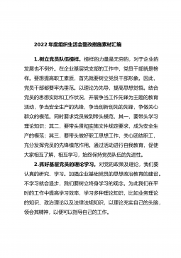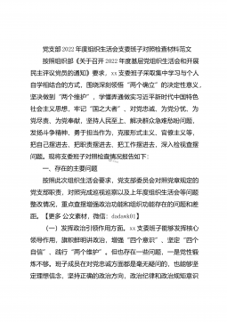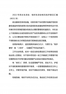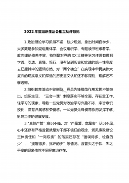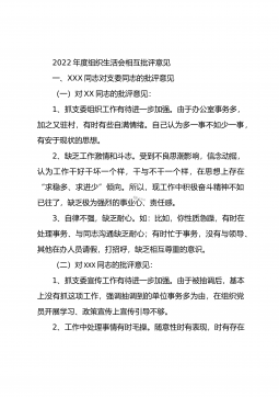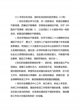 2022年民主生活会、组织生活会相互批评意见(50例)1.同志在理论学习方面,对一些新观点、新理论理解还不够深透、把握还不够精准,学用结合做得还不够。对于《中国共产党章程(修正案)》、以及党的二十大报告中的一些新名词,新提法的理解还不够透彻。2.同志学用结合不够紧密,在学习党的二十大精神时往往满足于学过了、看过了,在进村入户宣讲中未把镇十年来发展变革情况,同党的二十大报告中过去五年以及新时代十年的伟大变革的相结合。建议进一步深学彻悟习近平新时代中国特色社会主义思想的政治意义、历史意义和现实意义,不断提升理论素养,推动工作落实,做到学用结合、知行合一。3.同志抓发展的思路相对单一,前阶段,县委...