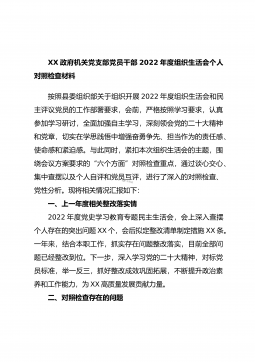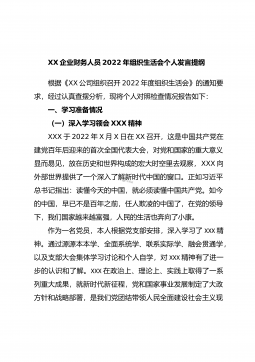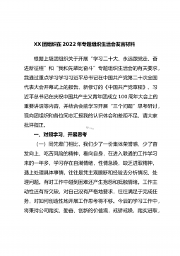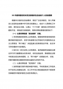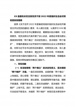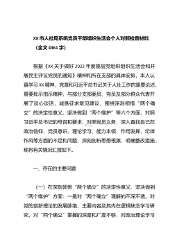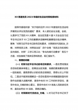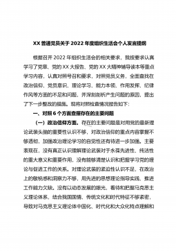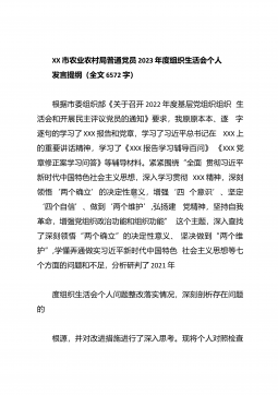 XX市农业农村局普通党员2023年度组织生活会个人发言提纲(全文6572字)根据市委组织部《关于召开2022年度基层党组织组织生活会和开展民主评议党员的通知》要求,我原原本本、逐字逐句的学习了XXX报告和党章,学习了习近平总书记在XXX上的重要讲话精神,学习了《XXX报告学习辅导百问》《XXX党章修正案学习问答》等辅导材料。紧紧围绕“全面贯彻习近平新时代中国特色社会主义思想,深入学习贯彻XXX精神,深刻领悟‘两个确立’的决定性意义,增强‘四个意识’、坚定‘四个自信’、做到‘两个维护’,弘扬建党精神,坚持自我革命,增强党组织政治功能和组织功能”这个主题,深入查找了深刻领悟“两个确立”的决定性意义...