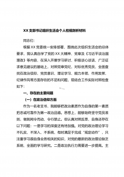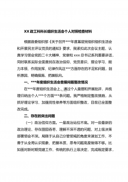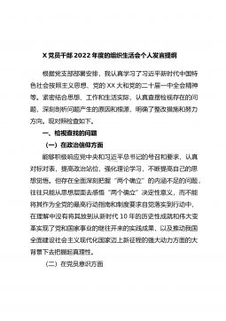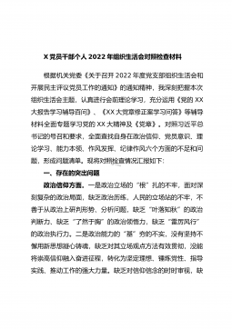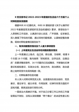 X党支部2022-2023年度组织生活会六个方面个人对照检查材料根据统一安排,会前本人认真开展学习研讨,学习了党的二十大精神及《习近平谈治国理政》第四卷等内容,同时,广泛征求意见建议,深入开展谈心谈话,全面检视剖析问题,做了扎实充分准备。现对照检查如下。一、查摆的问题(一)在政治信仰方面一是对“两个确立”的深刻内涵领悟不到位。在学习工作中,能够带头深刻感悟“两个确立”的决定性意义,坚定信仰信念信心,但对照反思还存在学得不够深入,理解得不够透彻、运用得也不够到位等问题。理论学习不够系统深入,开展学习比较单一,大多围绕上级要求的特定主题开展,学习钻研不够透彻,在理解理论的来龙去脉,判断的因果依据和...