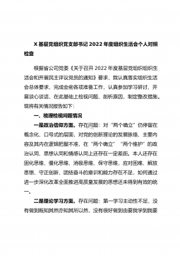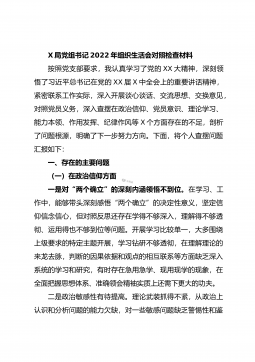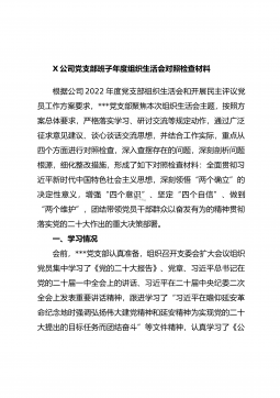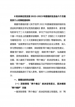 X机关单位党支部2022-2023年度组织生活会六个方面党员个人对照检查材料根据市委组织部《关于召开2022年度基层党组织组织生活会和开展民主评议党员的通知》要求,我原原本本、逐字逐句的学习了二十大报告和党章,学习了习近平总书记在党的二十届一中全会上的重要讲话精神,学习了《党的二十大报告学习辅导百问》《二十大党章修正案学习问答》等辅导材料。紧紧围绕“全面贯彻习近平新时代中国特色社会主义思想,深入学习贯彻党的二十大精神,深刻领悟'两个确立'的决定性意义,增强'四个意识'、坚定'四个自信'、做到'两个维护',弘扬建党精神,坚持自我革命,增强党组织政治功能和组织功能”这个主题,深入查找了深刻领悟“两...