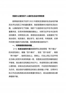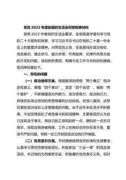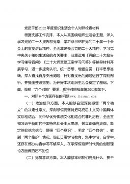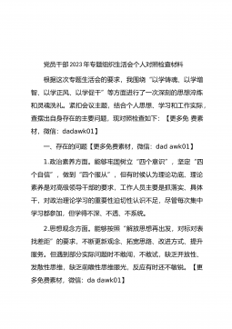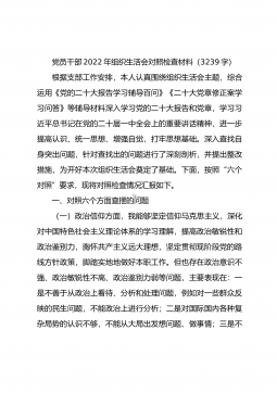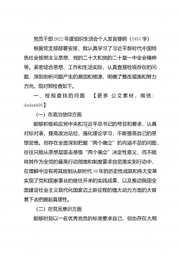 党员干部2022年度组织生活会个人发言提纲(1851字)根据党支部部署安排,我认真学习了习近平新时代中国特色社会按照主义思想、党的二十大和党的二十届一中全会精神等。紧密结合思想、工作和生活实际,认真查摆检视存在的问题,深刻剖析问题产生的原因和根源,明确了整改措施和努力方向。现对照检查如下。 一、检视查找的问题 【更多 公文素材,微信:dadawk01】(一)在政治信仰方面能够积极响应党中央和习近平总书记的号召和要求,认真对标对表,提高政治站位,强化理论学习,不断提高自己的思想觉悟。但存在全面深刻把握“两个确立”的内涵不足的问题,往往只能从思想层面去感悟“两个确立”决定性意义,而不能将其作为全党...