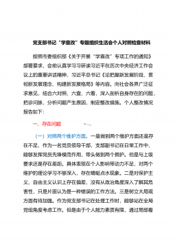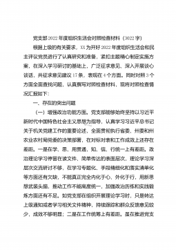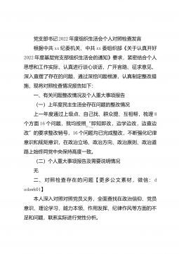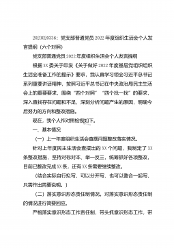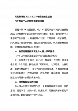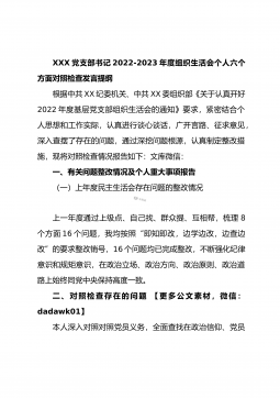 XXX党支部书记2022-2023年度组织生活会个人六个方面对照检查发言提纲根据中共XX纪委机关、中共XX委组织部《关于认真开好2022年度基层党支部组织生活会的通知》要求,紧密结合个人思想和工作实际,认真进行谈心谈话,广开言路、征求意见,深入查摆了存在的问题,通过深挖问题根源,认真制定整改措施,现将对照检查情况报告如下:文库微信:一、有关问题整改情况及个人重大事项报告(一)上年度民主生活会存在问题的整改情况上一年度通过上级点、自己找、群众提、互相帮,梳理8个方面16个问题,我均按照“即知即改,边学边改,边查边改”的要求整改销号,16个问题均已完成整改,不断强化纪律意识和规矩意识,在政治立场、...