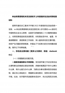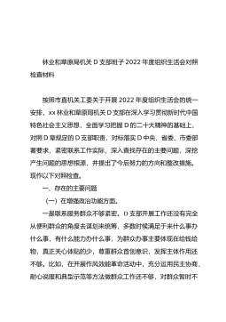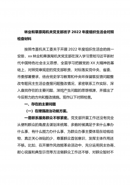林业和草原局机关党支部班子2022年度组织生活会对照检查材料按照市直机关工委关于开展2022年度组织生活会的统一安排,xx林业和草原局机关党支部在深入学习贯彻习近平新时代中国特色社会主义思想,全面学习把握党的XX大精神的基础上,对照党章规定的党支部职责,对标落实党中央、省委、市委部署要求,结合党史学习教育和中央环保督察反馈问题整改专题民主生活会查摆问题整改情况,紧密联系工作实际,深入查找存在的主要问题,深挖产生问题的思想根源,并提出了今后努力的方向和整改措施。现作以下对照检查。一、存在的主要问题(一)在增强政治功能方面。一是联系服务群众不够紧密。党支部开展工作还没有完全从便利群众的角度去谋划来...
